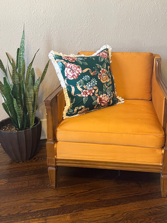 Deep Green Floral Pillow with fringe