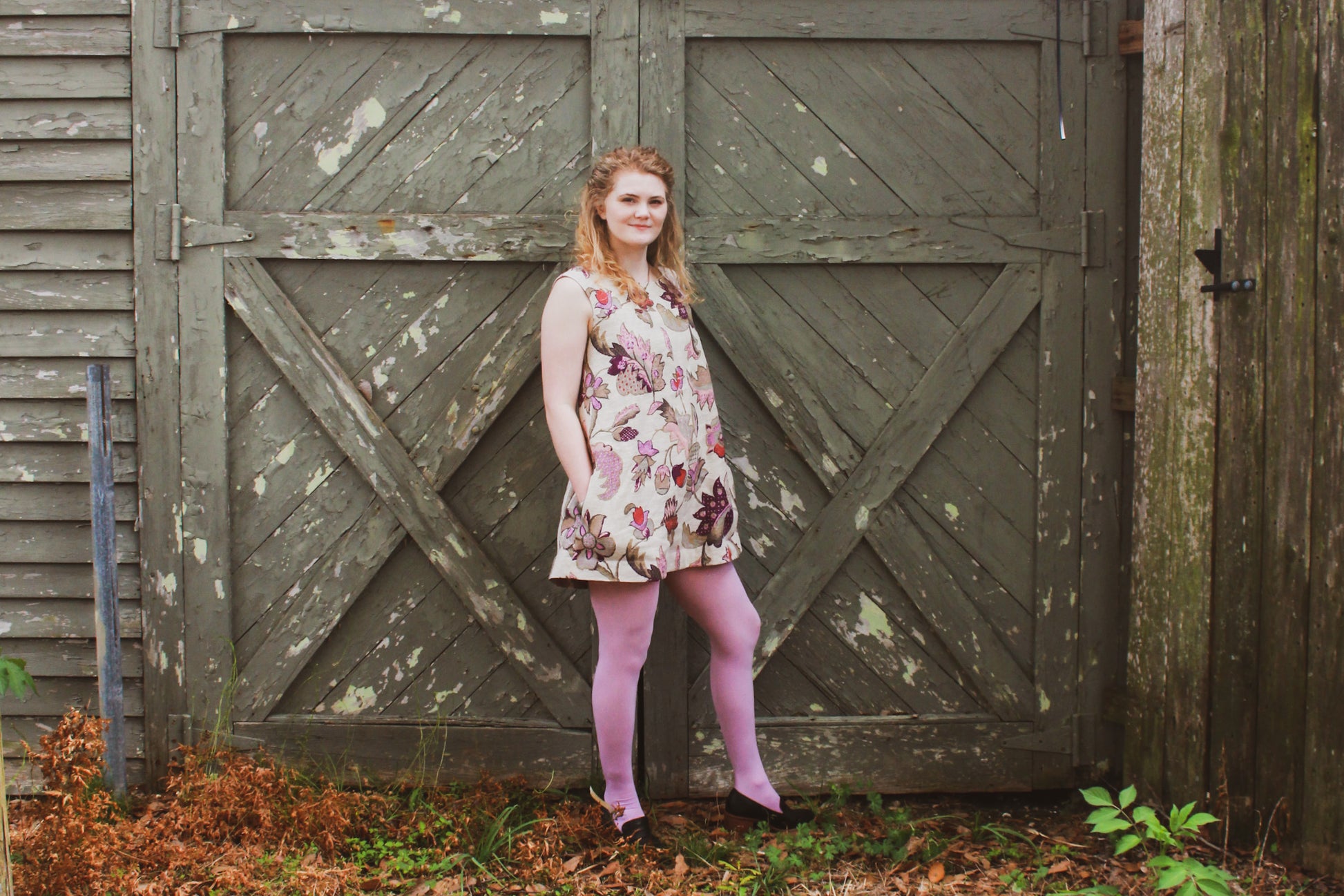 60s style, mini tent dress in pink and purple floral print. Decorative top stitching and set in pockets. Single button closer at back neck keyhole. Sleeveless style for layering in any season.