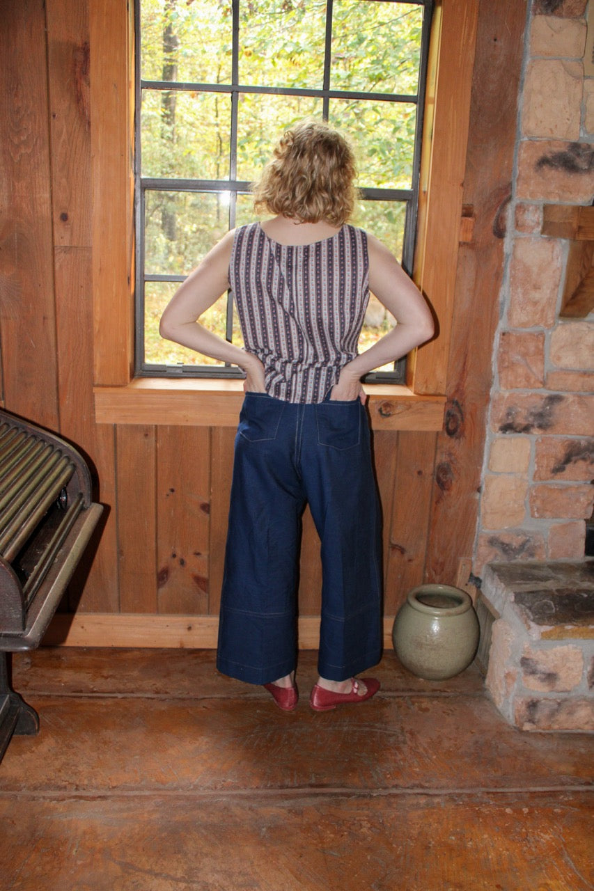 Handmade in Louisiana from vintage fabric, fiber content unknown. Perceived cotton denim. Pre shrunk. Wash cold, hang dry for lasting wear.