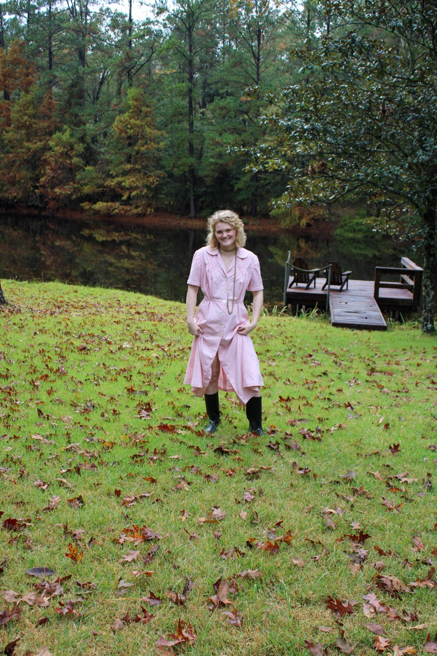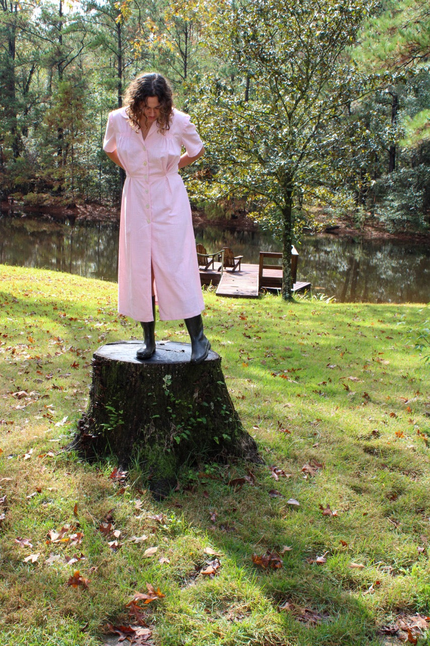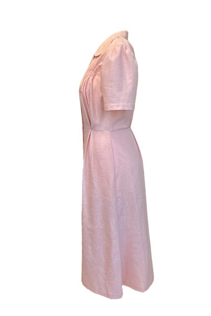 Shawl collar button down dress with shirred gathering detail. Double inverted pleats at waistline. Short sleeves. French seams
