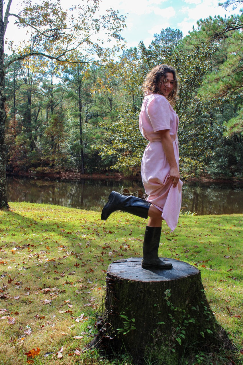 Handmade in Louisiana from vintage fabric, fiber content unknown. Perceived linen blend. Pre shrunk. Wash cold, hang dry for lasting wear.