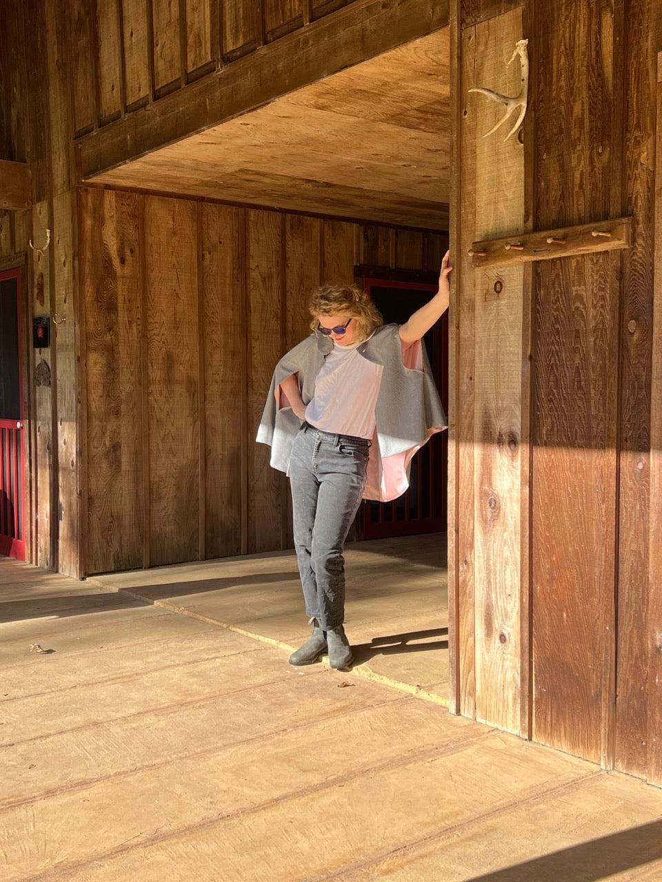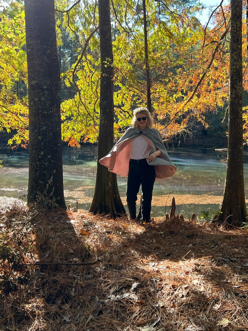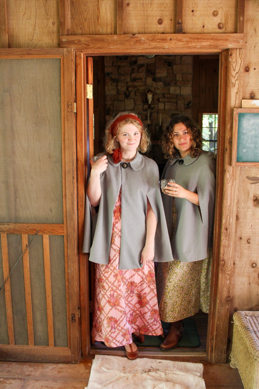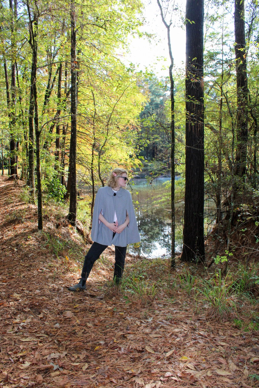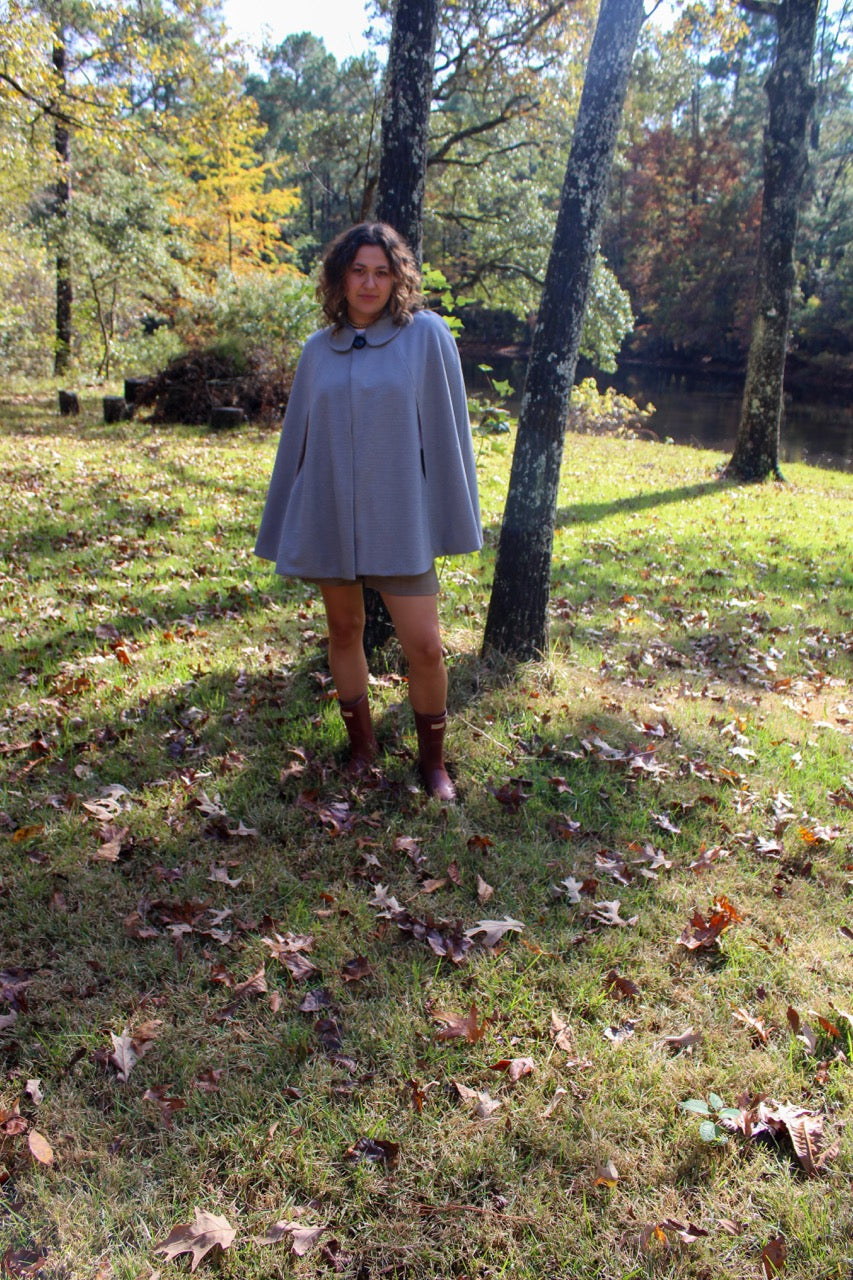 Cool weather cape with rolled collar. One of a kind single button closure. Arm slits.