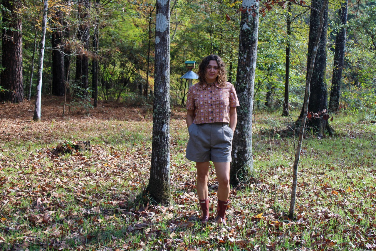 Rolled peter pan collar, cropped blouse with button closure down center front.