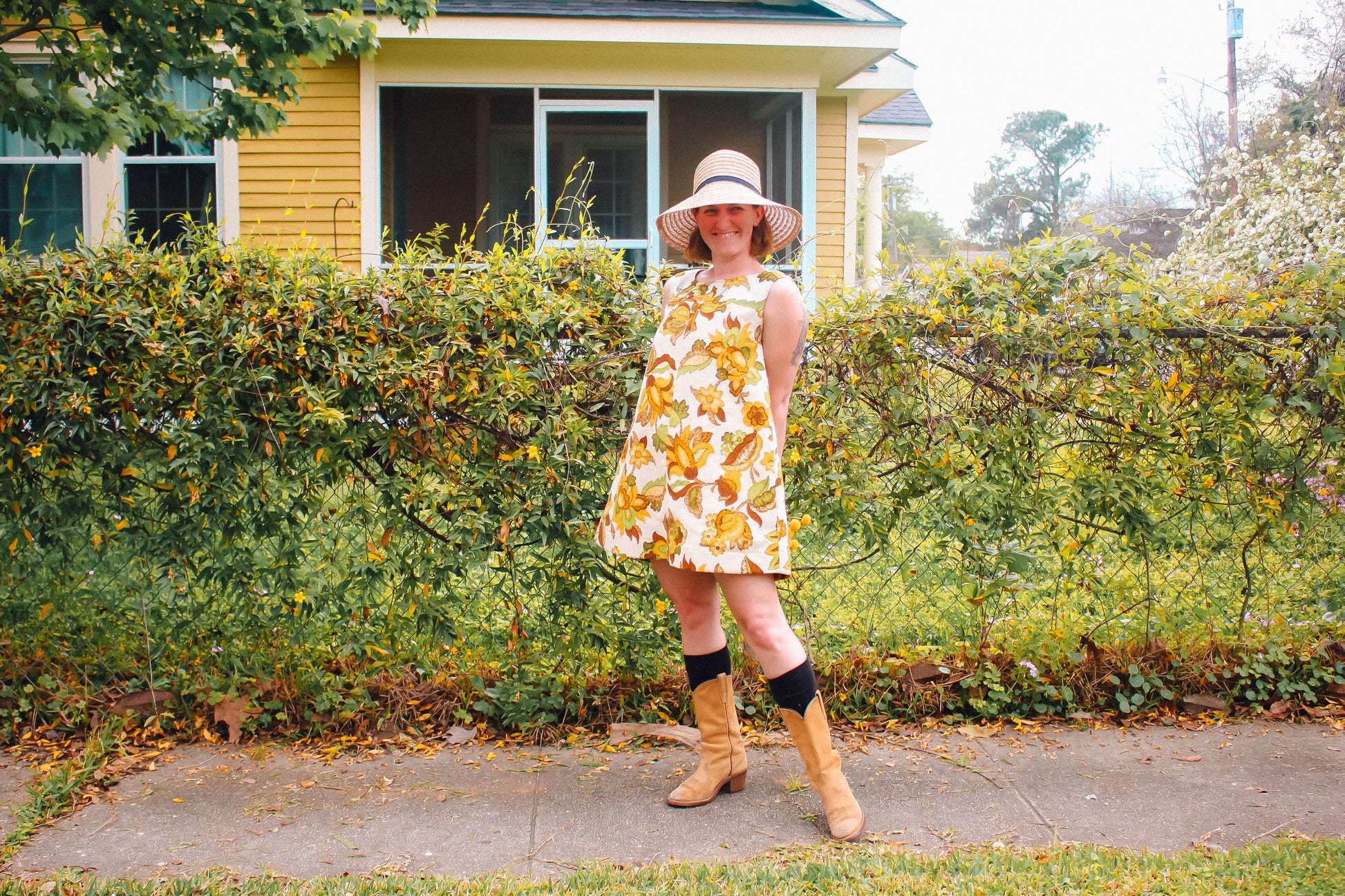 60s style, mini tent dress in yellow and green floral print. Decorative top stitching and set in pockets. Single button closer at back neck keyhole. Sleeveless style for layering in any season.